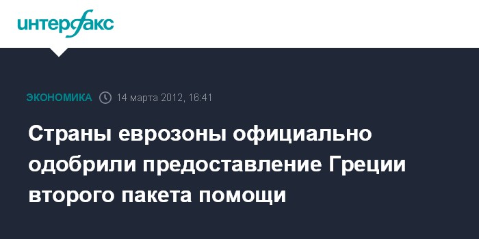 Брюссель. 14 марта. INTERFAX.RU - Государства еврозоны официально одобрили предоставление Греции второго пакета помощи объемом 130 млрд евро, сообщило агентство Bloomberg со ссылкой на заявление главы Еврогруппы Жана-Клода Юнкера. "Все требовавшиеся для этого национальные и парламентские процедуры были завершены", - отметил Ж.-К.Юнкер.
