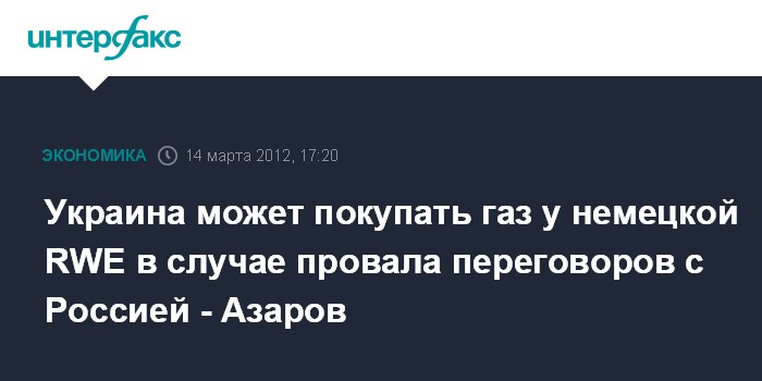 Киев. 14 марта. INTERFAX.RU - Если "газовые переговоры" с Россией закончатся неудачей, Украина может покупать российский газ у немецкой компании RWE, заявил премьер-министр Украины Николай Азаров в интервью немецкой газете Die Welt.
