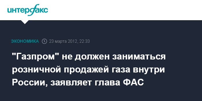"Газпром" не должен заниматься розничной продажей газа внутри России, заявляет глава ФАС