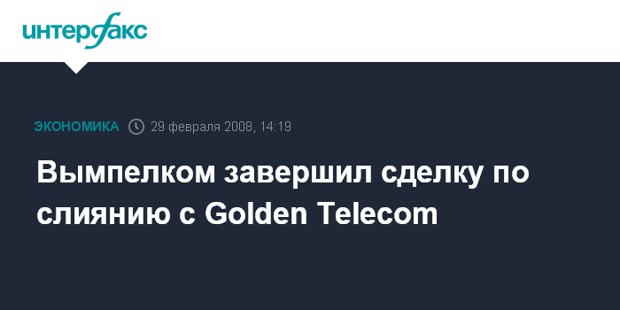 Москва. 29 февраля. INTERFAX.RU - ОАО "Вымпелком" завершило сделку по слиянию своей дочерней компании Lillian Acquisition с холдингом Golden Telecom Inc., говорится в сообщении сотового оператора.