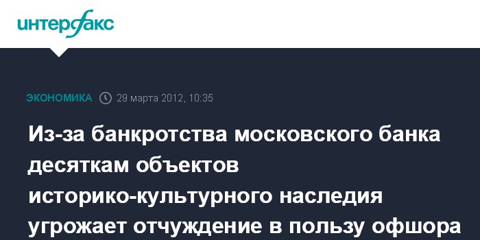 Из-за банкротства московского банка десяткам объектов историко-культурного наследия угрожает отчуждение в пользу офшора