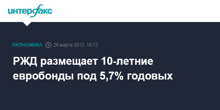 Москва. 29 марта. INTERFAX.RU - ОАО "Российские железные дороги" (РЖД) размещает 10-летние евробонды с доходностью 5,7% годовых, сообщил агентству "Интерфакс-АФИ" источник в финансовых кругах.