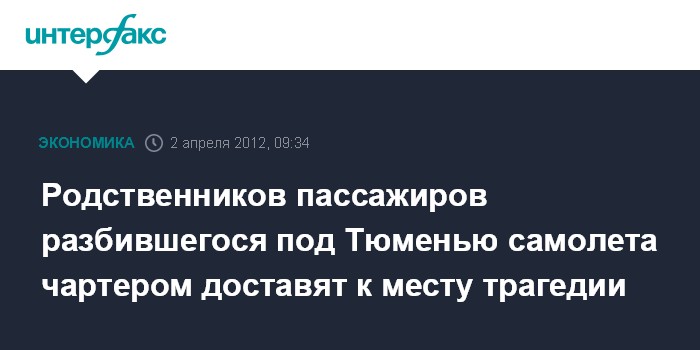 Тюмень. 2 апреля. INTERFAX.RU - Авиакомпании "ЮТэйр" организовывает чартерный рейс для родственников пассажиров разбившегося под Тюменью самолета, говорится в сообщении на сайте авиакомпании.