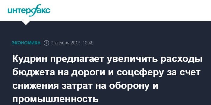 Москва. 3 апреля. INTERFAX.RU - Экс-министр финансов РФ Алексей Кудрин предлагает профинансировать увеличение расходов бюджета РФ на дороги, образование и здравоохранение за счет сокращения расходов на оборону, национальную безопасность и на субсидии промышленности.