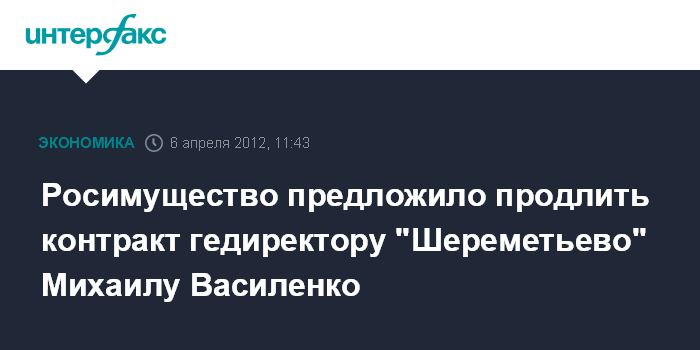 Москва. 6 апреля. INTERFAX.RU - Росимущество предложило продлить контракт генерального директора ОАО "Международный аэропорт Шереметьево" Михаила Василенко сроком на два года.