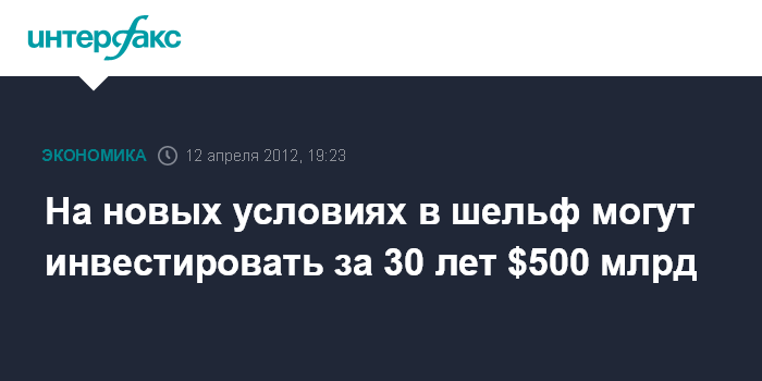 Москва. 12 апреля. INTERFAX.RU - На новых условиях инвестиции в освоение шельфовых проектов могут составить порядка $500 млрд за 30 лет, сообщил премьер-министр РФ Владимир Путин в ходе совещания по вопросу стимулирования освоения континентального шельфа.