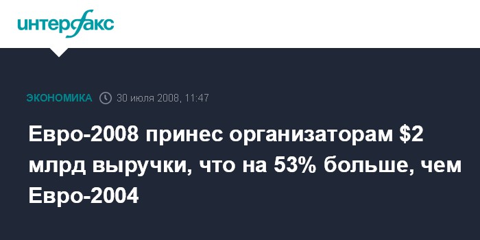 Москва. 30 июля. INTERFAX.RU - Чемпионат Европы по футболу, прошедший в июне в Австрии и Швейцарии, принес 1,3 млрд евро ($2 млрд) в виде поступлений от продажи телевизионной рекламы, билетов и спонсорских пакетов, говорится в сообщении оргкомитета турнира.