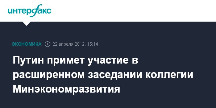 Москва. 22 апреля. INTERFAX.RU - Премьер-министр Владимир Путин выступит на расширенном заседании коллегии министерства экономического развития, сообщили в пресс-службе правительства.