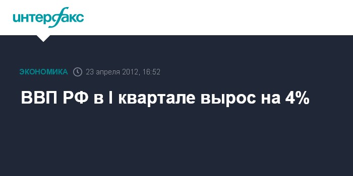 Москва. 23 апреля. INTERFAX.RU - ВВП России, по оценке Минэкономразвития, в первом квартале 2012 г. вырос на 4% по сравнению с первым кварталом 2011 г., заявила глава Минэкономразвития РФ Эльвира Набиуллина, выступая на коллегии министерства в понедельник в Москве.
