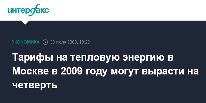 Москва. 30 июля. ИНТЕРФАКС - ОАО "Московская объединенная энергетическая компания" (МОЭК) ожидает роста тарифов на тепловую энергию в Москве в 2009 году на уровне порядка 25%, сообщил журналистам в среду глава компании Александр Ремезов.