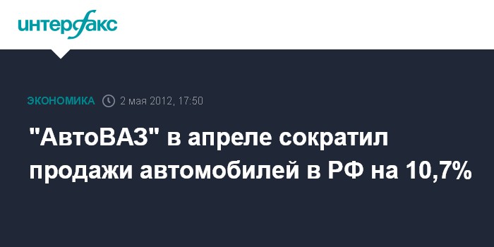Самара. 2 мая. INTERFAX.RU - ОАО "АвтоВАЗ" по итогам работы в апреле 2012 года сократило продажи легковых автомобилей в РФ на 10,7% по сравнению с апрелем 2011 года - до 50 тыс. 102 единиц, говорится в сообщении компании.