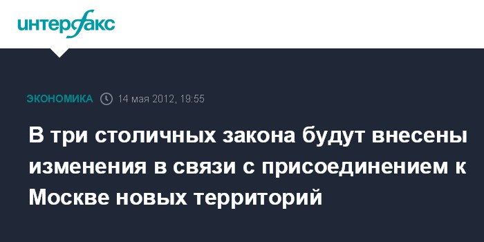14 мая. INTERFAX.RU - В три столичных закона, касающихся налогообложения, будут внесены изменения в связи с присоединением к Москве с 1 июля новых территорий.