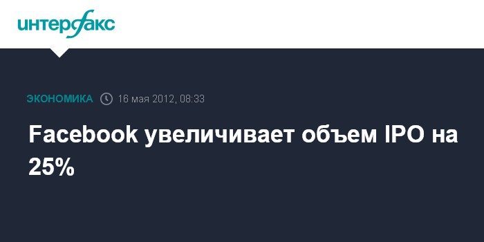 Лондон. 16 мая. INTERFAX.RU - Социальная сеть Facebook увеличит объем размещаемых на рынке акций на 25%, что должно позволить ей привлечь в результате IPO до 16 млрд, сообщает агентство Bloomberg со ссылкой на источники на рынке.
