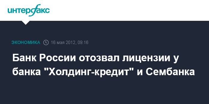 Москва. 16 мая. INTERFAX.RU - Банк России принял решение об отзыве лицензий на осуществление банковских операций с 16 мая у двух московских банков - "Холдинг-кредита" и Сембанка (регистрационные номера - 3030 и 2606), говорится в материалах ЦБ РФ.
