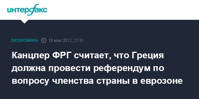 Лондон. 18 мая. INTERFAX.RU - Власти Греции должны провести референдум по вопросу членства страны в еврозоне одновременно с парламентскими выборами в июне этого года, сообщает британский телеканал Sky News со ссылкой на канцлера ФРГ Ангелу Меркель.