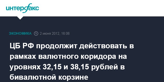 Горки. 2 июня. INTERFAX.RU - Центробанк РФ продолжит действовать в рамках ранее объявленных правил плавающего валютного коридора, границы которого установлены на уровнях 32,15 и 38,15 рублей в бивалютной корзине. Об этом стало известно по итогам совещания, посвященного ситуации на мировых финансовых рынках, которое в субботу провел премьер-министр РФ Дмитрий Медведев.