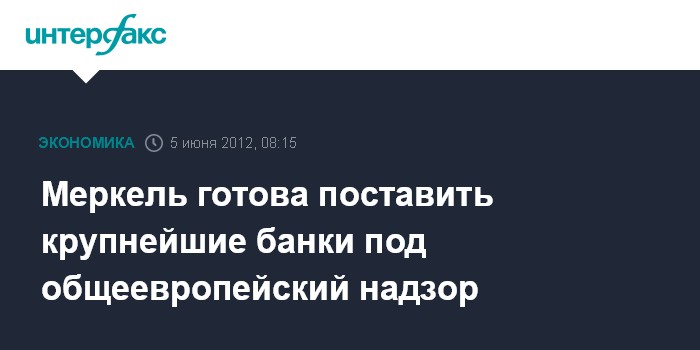 Москва. 5 июня. INTERFAX.RU - Канцлер Германии Ангела Меркель в понедельник выразила готовность рассмотреть вопрос о создании общеевропейского банковского надзора над 27 крупнейшими финансовыми институтами Евросоюза, сообщает The Wall Street Journal.