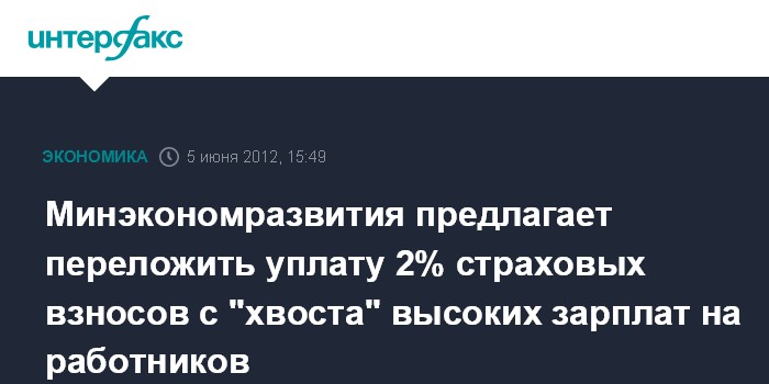 Москва. 5 июня. INTERFAX.RU - Минэкономразвития по-прежнему считает целесообразным рассмотреть вопрос о возможности снижения страховых взносов с 30% до 28%, вернуться к уплате единого социального налога, повысить на 2-3% страховые взносы для вредных производств, а также переложить уплату 2% страховых взносов с так называемого "хвоста" высоких зарплат на работников.