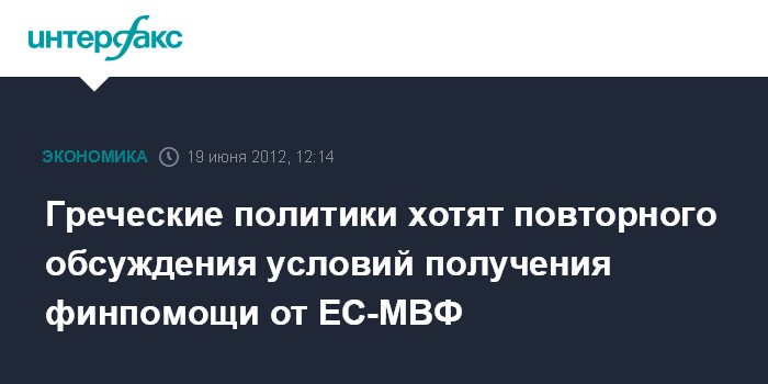 Афины. 19 июня. INTERFAX.RU - Греческие политики намерены повторно обсудить условия, на которых страна получает финансовую помощь от партнеров по Европейскому союзу и Международному валютному фонду (МВФ), сообщает агентство Bloomberg.