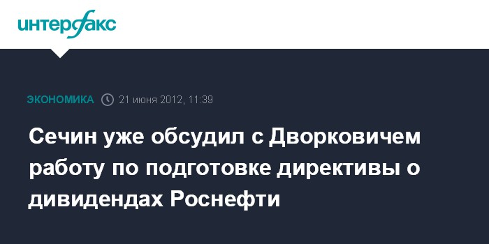 Санкт-Петербург. 21 июня. INTERFAX.RU - Президент "Роснефти" Игорь Сечин уже обсудил с вице-премьером РФ Аркадием Дворковичем дальнейшую работу по подготовке правительственной директивы о выплате дополнительных дивидендов акционерам "Роснефти".