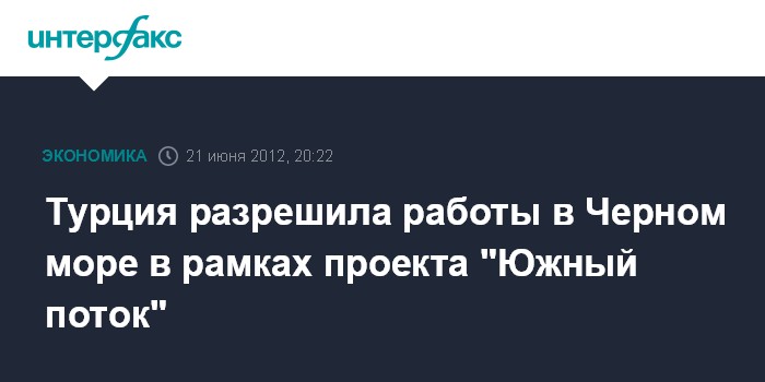 Санкт-Петербург. 21 июня. INTERFAX.RU - Правительство Турции выдало России разрешение на работу в исключительной экономической зоне Турции в Черном море в рамках проекта "Южный поток", сообщил президент РФ Владимир Путин.