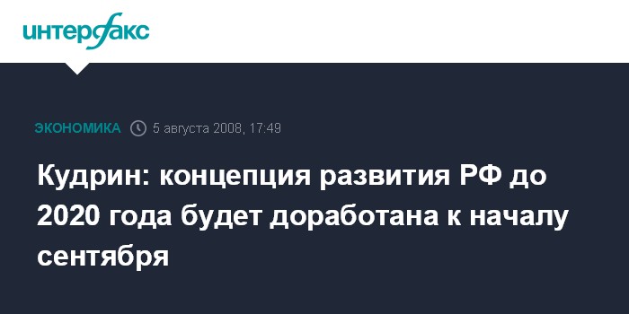 Москва. 5 августа. INTERFAX.RU - Концепция долгосрочного развития РФ до 2020 г. будет доработана к началу сентября с учетом финансового плана на 15 лет, который готовится Минфином, сообщил вице-премьер, министр финансов РФ Алексей Кудрин журналистам. "Концепция внесена в правительство, но в настоящее время направлена на дополнительное согласование с министерствами и ведомствами", - сказал он.