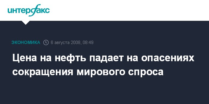 Москва. 6 августа. INTERFAX.RU - Нефть падает третий день подряд на опасениях сокращения мирового спроса, сообщило агентство Bloomberg. Цена фьючерсного контракта на нефть марки WTI на сентябрь в электронной системе Нью-йоркской товарной биржи (NYMEX) в среду утром снизилась на $1,07 относительно уровня закрытия торгов 5 августа и составляет $118,1 за баррель. Цена сентябрьского контракта на WTI во вторник рухнула на $2,24 - до $119,17 за баррель.