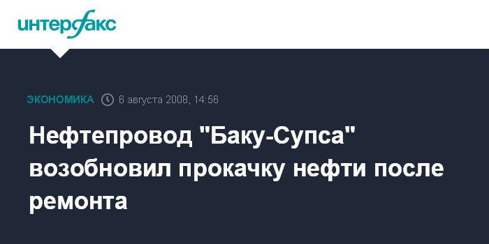 Москва. 6 августа. INTERFAX.RU - Нефтепровод Баку-Супса после ремонтных работ возобновил прокачку азербайджанской нефти на мировой рынок, сообщили "Интерфаксу" в компании ВР-Georgia.