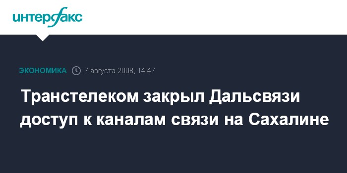 Письменное уведомление от "Транстелекома" о том, что предоставление услуг доступа к каналам связи на Сахалине будет приостановлено, "Дальсвязь" получила вечером 6 августа, говорится в сообщении. Через полчаса после получения уведомления "Транстелеком" закрыл доступ к каналам сети Интернет на Сахалине, а 7 августа в 09:15 был закрыт доступ к внутризоновой и междугородней связи.