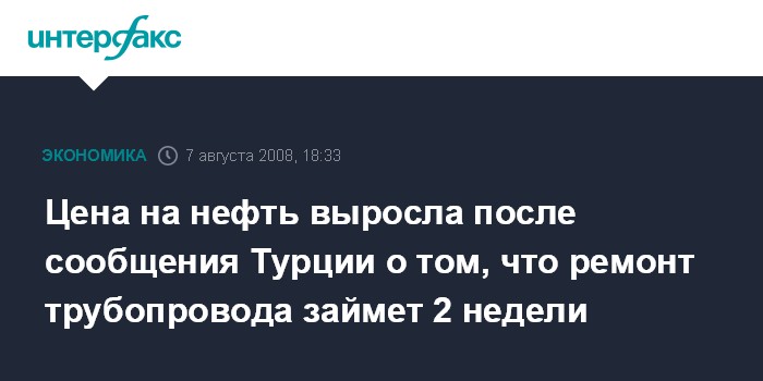 Москва. 7 августа. INTERFAX.RU - Нефть дорожает впервые за четыре дня после сообщения Турции о том, что ремонт трубопровода Баку-Тбилиси-Джейхан (БТД) может занять две недели, сообщает агентство Bloomberg.