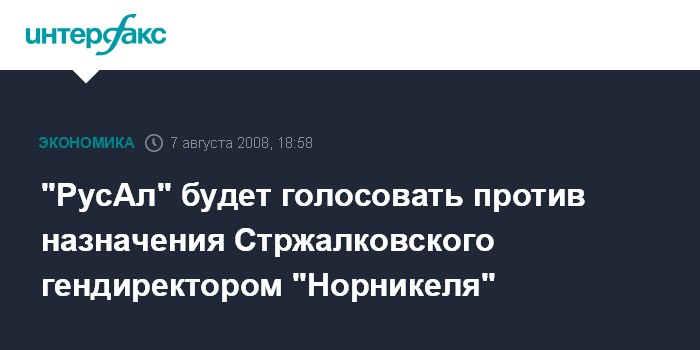 Москва. 7 августа. INTERFAX.RU - ОК "РусАл", владеющая 25%+2 акциями АО "ГМК "Норильский никель", на заседании совета директоров "Норникеля" 8 августа будет голосовать против назначения Владимира Стржалковского гендиректором ГМК, говорится в сообщении "РусАла".