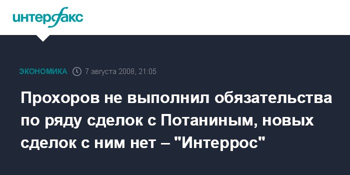 Москва. 7 августа. ИНТЕРФАКС - Михаил Прохоров в апреле-мае 2008 года не выполнил обязательства перед Владимиром Потаниным по заключению ряда сделок с акциями "Норильского никеля" (РТС: GMKN) и "Полюс Золота", говорится в заявлении "Интерроса".