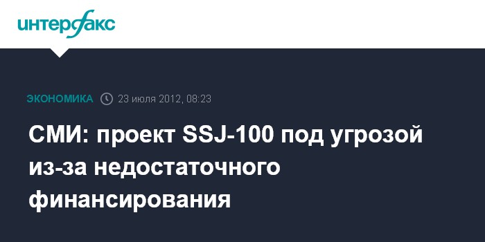 Москва. 23 июля. INTERFAX.RU - Счетная палата (СП) указывает на нехватку бюджетного финансирования проекта SuperJet-100 (SSJ-100) "Гражданских самолетов Сухого" (ГСС), из-за чего страдает программа продаж самолетов, пишет газета "Ведомости" в понедельник.