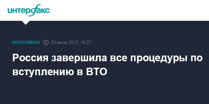 Таким образом, завершены все процедуры на пути вступления РФ в ВТО, и через 30 дней, то есть с 23 августа 2012 года Россия станет полноправным членом этой организации.
