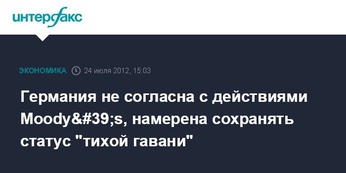 Берлин. 24 июля. INTERFAX.RU - Правительство ФРГ выразило несогласие с действиями рейтингового агентства Moody's, заявив, что Германия останется "тихой гаванью" в Европе в период финансового кризиса, сообщает агентство Bloomberg.
