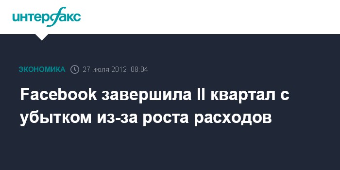 Сан-Франциско. 27 июля. INTERFAX.RU - Оператор крупнейшей в мире социальной сети Facebook Inc., который в мае провел IPO на бирже Nasdaq и привлек в ходе размещения $16 млрд, завершил второй квартал 2012 года с убытком из-за роста расходов.