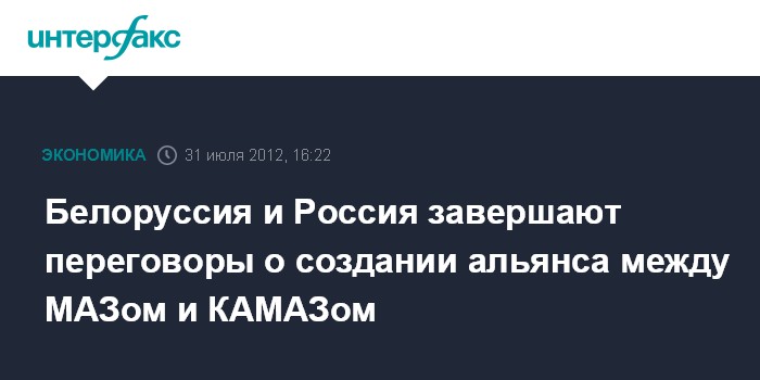 Минск. 31 июля. INTERFAX.RU - Министр промышленности и торговли России Денис Мантуров констатирует, что переговоры между Белоруссией и Россией о создании альянса на базе МАЗа и КАМАЗа вступили в завершающую стадию.