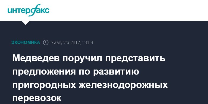 Омск. 5 августа. INTERFAX.RU - Премьер-министр РФ Дмитрий Медведев поручает правительству представить предложения по развитию пригородных железнодорожных перевозок на ближайшие годы.