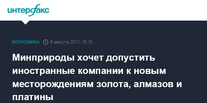 Москва. 8 августа. INTERFAX.RU - Минприроды подготовило поправки в закон "О недрах", которые фактически предоставят иностранным недропользователям гарантию освоения стратегических месторождений золота, алмазов и металлов платиновой группы в случае их открытия таким недропользователем.