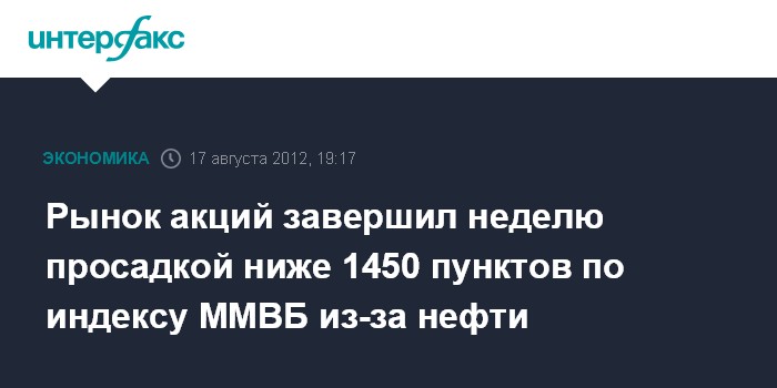 Москва. 17 августа. INTERFAX.RU - Рынок акций РФ завершил неделю просадкой ниже рубежа 1450 пунктов по индексу ММВБ из-за фиксации прибыли игроками перед выходными днями на фоне подешевевшей нефти и неплохой статистики из США, сократившей вероятность новых мер стимулирования от ФРС США.