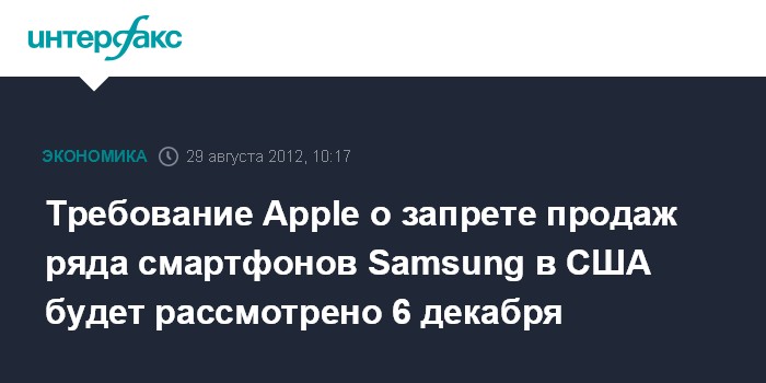 Сан-Хосе. 29 августа. INTERFAX.RU - Заявление Apple Inc. о запрете продаж в США восьми моделей смартфонов южнокорейской Samsung Electronics Co., направленное в окружной суд американского города Сан-Хосе, штат Калифорния, накануне, будет рассмотрено 6 декабря, сообщает агентство Bloomberg.
