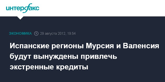 Мадрид. 29 августа. INTERFAX.RU - Испанские регионы Мурсия и Валенсия, как и Каталония, будут вынуждены привлечь экстренные кредиты из правительственного фонда, сообщает агентство Bloomberg.