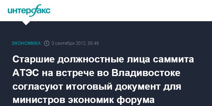 Владивосток. 3 сентября. ИНТЕРФАКС-ДАЛЬНИЙ ВОСТОК - Во Владивостоке участники встречи Старших должностных лиц (СДЛ) АТЭС в понедельник планируют согласовать для министров экономик форума итоговые рекомендации, работа над которыми велась с начала года.