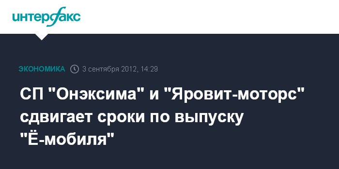 Москва. 3 сентября. INTERFAX.RU - "Ё-авто" (СП "группы "Онэксим" Михаила Прохорова и ЗАО "Яровит-моторс") отложило запуск завода по выпуску автомобилей со второй половины 2012 г. на конец 2014 - начало 2015 года.
