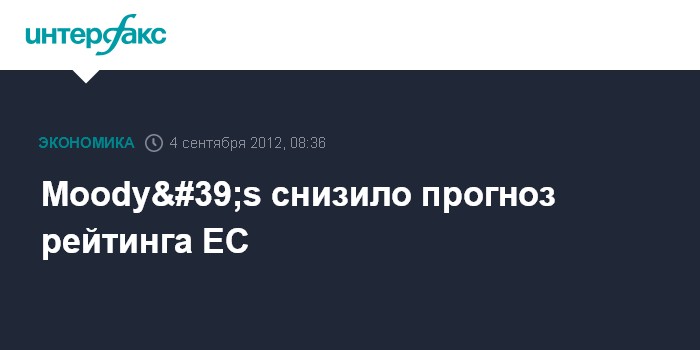 Москва. 4 сентября. INTERFAX.RU - Международное рейтинговое агентство Moody's Investors Service снизило прогноз рейтинга Евросоюза до "негативного" со "стабильного" в связи с рисками для крупнейших стран ЕС. Рейтинг ЕС составляет по шкале агентства "ААА".