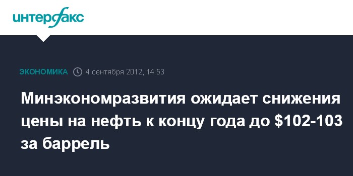 Москва. 4 сентября. INTERFAX.RU - Минэкономразвития ожидает, что цена на нефть марки Urals снизится к концу года до $102-103 за баррель, но в 2013-2015 году может быть выше заложенного в базовый вариант прогноза, сообщил "Финмаркет".