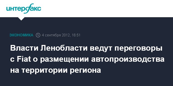 Москва. 4 сентября. INTERFAX.RU - Вице-губернатор Ленинградской области Дмитрий Ялов заявил, что ведутся переговоры с концерном Fiat-Chrysler о размещении автопроизводства на территории региона. "Они (переговоры) ведутся буквально каждый день. Мы плотно работаем", - отметил Ялов, добавив, что в настоящее время власти и концерн договорились воздержаться от дополнительных комментариев.