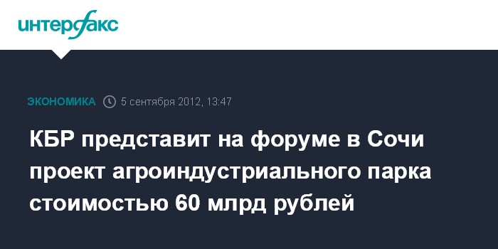 Нальчик. 5 сентября. INTERFAX.RU - Кабардино-Балкария представит на ХI Международном инвестиционном форуме "Сочи-2012" инвестпроект агроиндустриального парка стоимостью около 60 млрд рублей, сообщили агентству "Интерфакс-Юг" в Минэкономразвития республики.