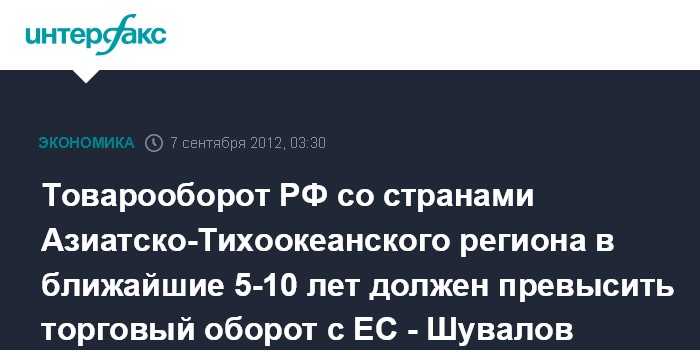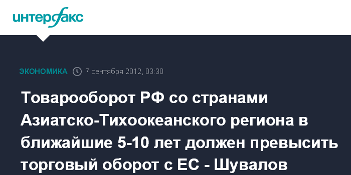 Товарооборот РФ со странами Азиатско-Тихоокеанского региона в ближайшие 5-10 лет должен превысить торговый оборот с ЕС - Шувалов