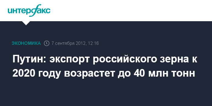 Остров Русский. 7 сентября. INTERFAX.RU - Президент РФ Владимир Путин заявил, что к 2020 году производство зерна в России может составить 120-125 млн тонн, а экспорт вырасти до 35-40 млн тонн.